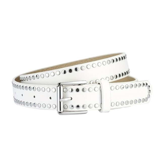 Deze stoere stud riem mag niet ontbreken in jouw kledingkast. Draag de riem in een jeans of om jouw middel bij een jurkje. Deze riem heeft een zilveren gesp en studs.