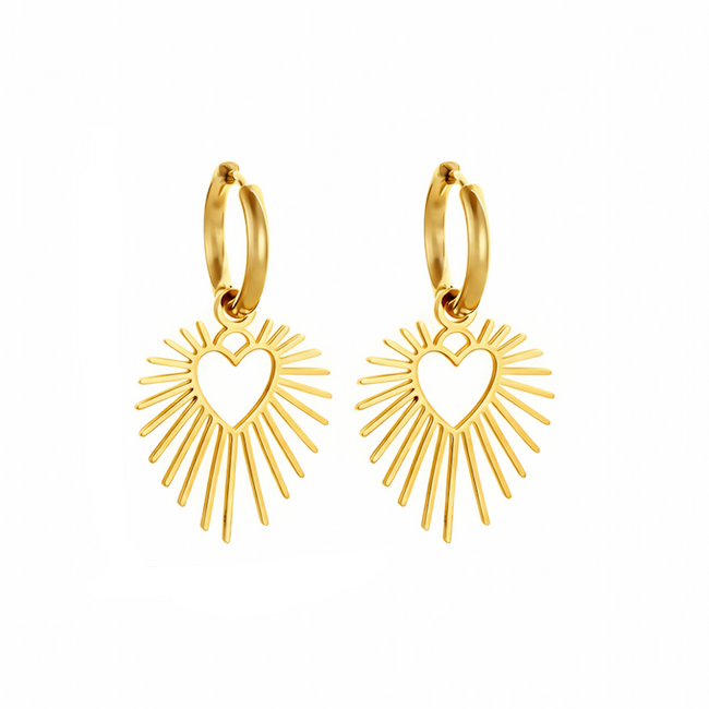 Deze oorbellen stralen liefde, kracht en elegantie uit. Het hartvormige detail in combinatie met de zonachtige lijnen geeft een unieke, moderne look. Draag ze solo als statement of combineer ze met andere sieraden voor een trendy ear-party.